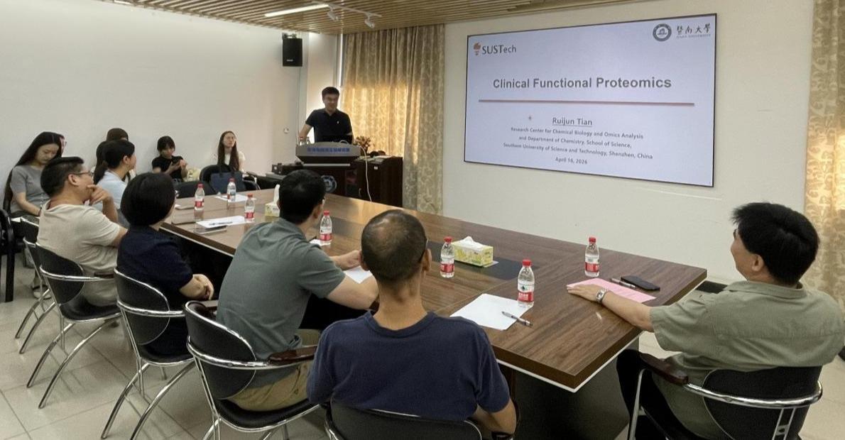 为庆祝暨南大学建校120周年,搭建高水平学术交流平台,4月16日上午,由暨南大学肿瘤分子生物学教育部重点实验室主办的“名师讲坛”系列学术活动在第二理工楼903会议室顺利举行。南方科技大学田瑞军教授受邀作题为“临床功能蛋白质组学” 的学术报告。本次讲座由重点实验室主任何庆瑜教授主持,生物化学与分子生物学系主任张志毅研究员、副主任孙雪松研究员、实验室科研骨干及研究生共50余人参加。